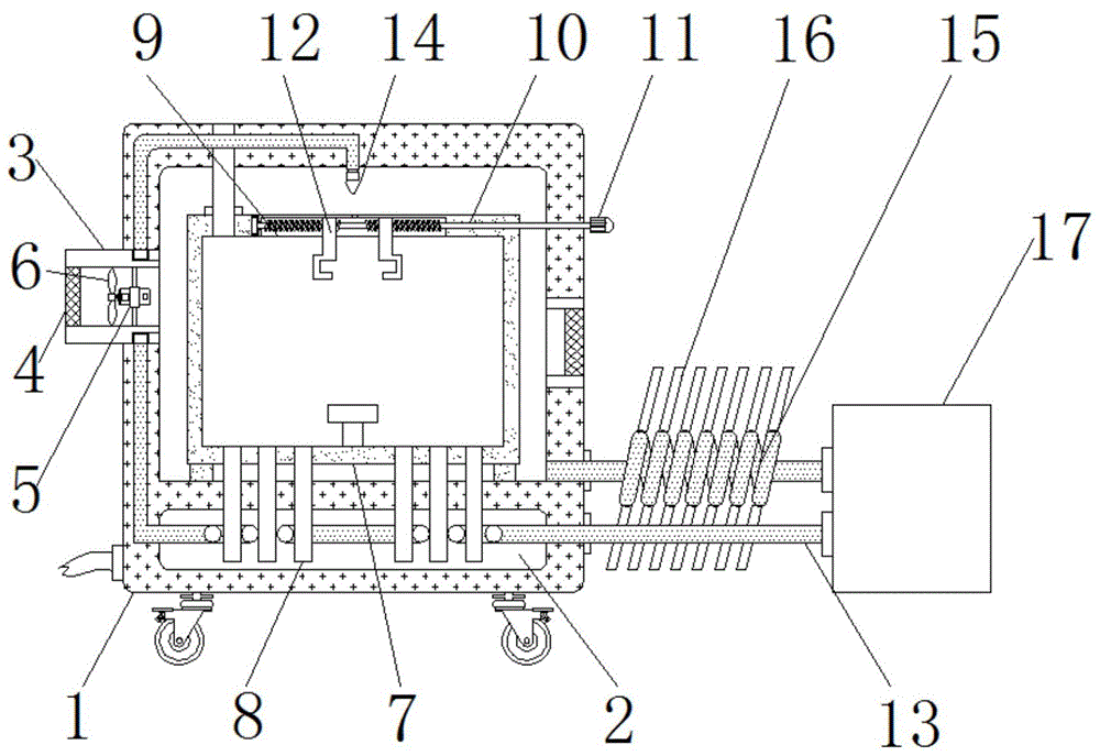 圖中:1、鍍膜機外壁;2、空腔;3、排風管;4、過濾網(wǎng);5、驅(qū)動電機;6、扇葉;7、鍍膜機內(nèi)壁;701、導流槽;8、導熱片;9、滑動槽;10、螺紋桿;11、調(diào)節(jié)旋鈕;12、基片夾板;13、進水管;14、霧化噴頭;15、排水管;16、散熱鰭;17、冷卻機。